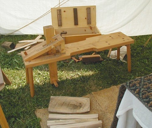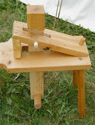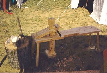The shaving horse is a simple foot-operated vice that allows you to hold a piece while having both hands free to work. A shaving horse is relatively easy to build and extremely useful to anyone who uses hand tools to shape spindles for turning, chair legs, barrel staves, shingles, and the like. It is traditionally used with a drawknife or spokeshave, but can be adapted for use with other tools. For example, by holding a rabbet plane in the dumbhead, you can shape thin stock by drawing it against the iron.