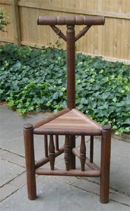 A close cousin to the triangle stool is the triangular "backstool," where the back post is extended up to provide back support. This style appears in artwork at the end of the 15th century, increasing in popularity through the 16th century. In the most common type, there is a curved backrest supported by two or four struts. In a less common type, the backrest is a turned cylinder, also supported by struts. There is also a single example (that I'm aware of) where the backpost ends in a ball fineal and there is no backrest at all. In general, triangle backstools are illustrated as furniture for the lower and middling sorts; presumably the better off could afford more fashionable joined chairs. Though also illustrated with some frequency in period art, no examples appear to have survived.