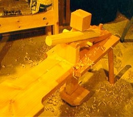 When working with manual lathes, it helps to shape the wood as much as possible before putting it on the lathe. This can be done through splitting and using a drawknife. A shaving horse is a useful tool to do this, first documented in De Re Metallica (1568).4