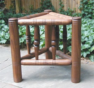 I find triangle stools elegant in their simplicity. No advanced turning skills are required, as the spindles require only simple tapers and decorative grooves. The challenge comes in the triangular geometry of the joints. While no examples of this once-common form appear to have survived, surviving three-post chairs do not have equilateral seats and it is unlikely that stools of this design did either. By allowing the front edge to be wider than the back edges, you simplify the joinery (and make a more comfortable stool to boot).