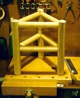 Each pair of rails is supported by a pair of vertical spindles. These are usually undecorated and thinner than the rails (say, 3/4 inch in this case), though sometimes they are illustrated with knobs and grooves. Decorative rings on the rails mark where the mortises for these need to be bored, but you must take care that they are correctly oriented with regard to the tapers of the rail's tenons. Do not make these holes excessively deep or they will weaken the rail.